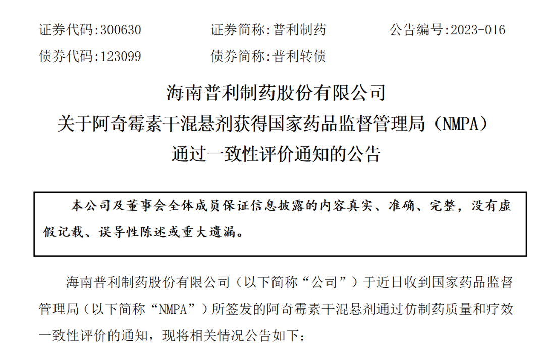 【喜报】实现儿童精准给药,普利制药阿奇霉素干混悬剂中国获批上市!