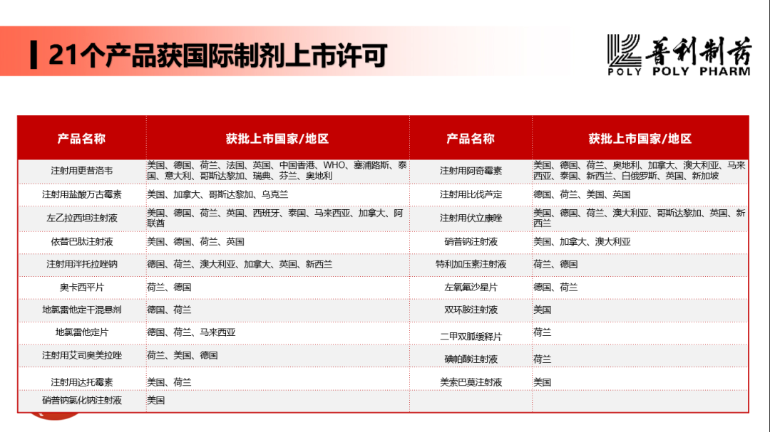普利制药1992年成立于海口,是中国医药制剂国际化先导企业和国家工信部智能制造示范企业;自2005年以来,普利制药不断深化药品国际化开拓,共有21款制剂和13款原料药产品获得国际上市。