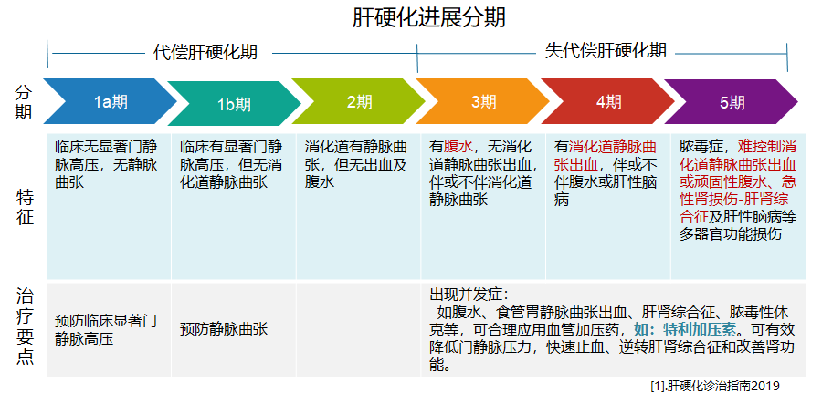 据调查显示,我国目前肝硬化患者约700万,且仍呈增长趋势。在临床上,对肝硬化的进展分为5期,代偿期(1、2期)和失代偿期(3、4、5期),其年病死率分别为1.5%、2%、10%、21%和87%。对于肝硬化患者进展到失代偿期,影像学检查可有典型门静脉高压及肝硬化证据,多数临床特征伴有腹水、消化道出血、肝性脑病等并发症。